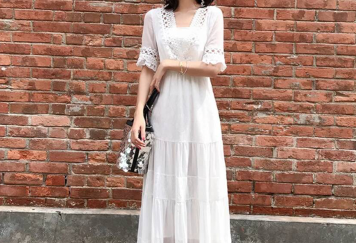 白色的蕾絲長(zhǎng)裙不知不覺中多了一點(diǎn)仙氣,鞋和很好搭配,一雙綁帶涼鞋活小白鞋都可以呀,穿上飄逸的白色的蕾絲長(zhǎng)裙你就是仙女本人啦!