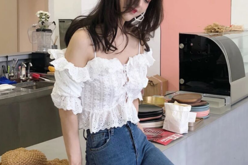 深V領(lǐng)的蕾絲上衣,很顯高檔次的蕾絲設(shè)計(jì),穿上很顯高級(jí)感,搭配牛仔褲,這樣的混搭很有女人味,從側(cè)面看過去超級(jí)大氣。